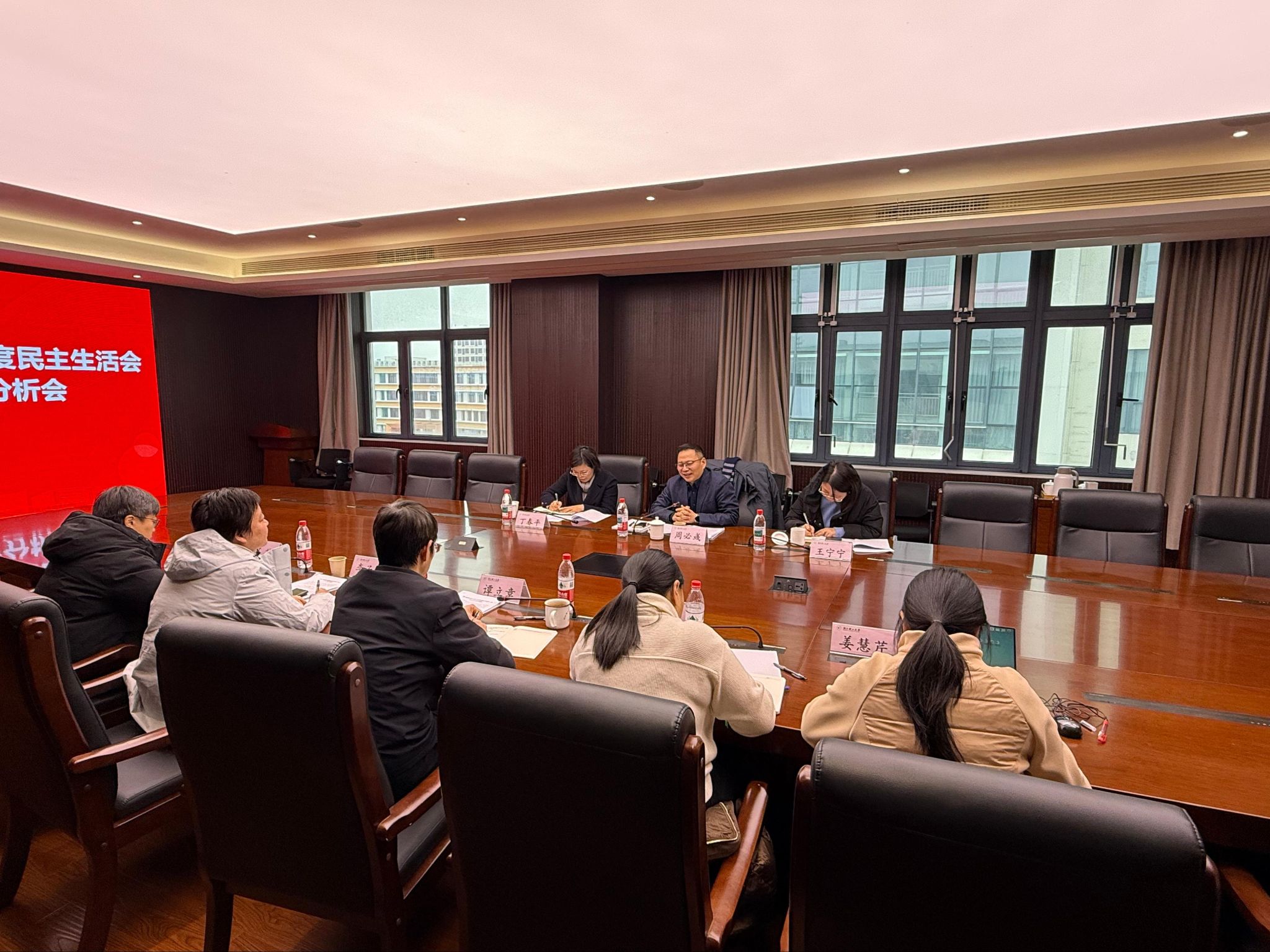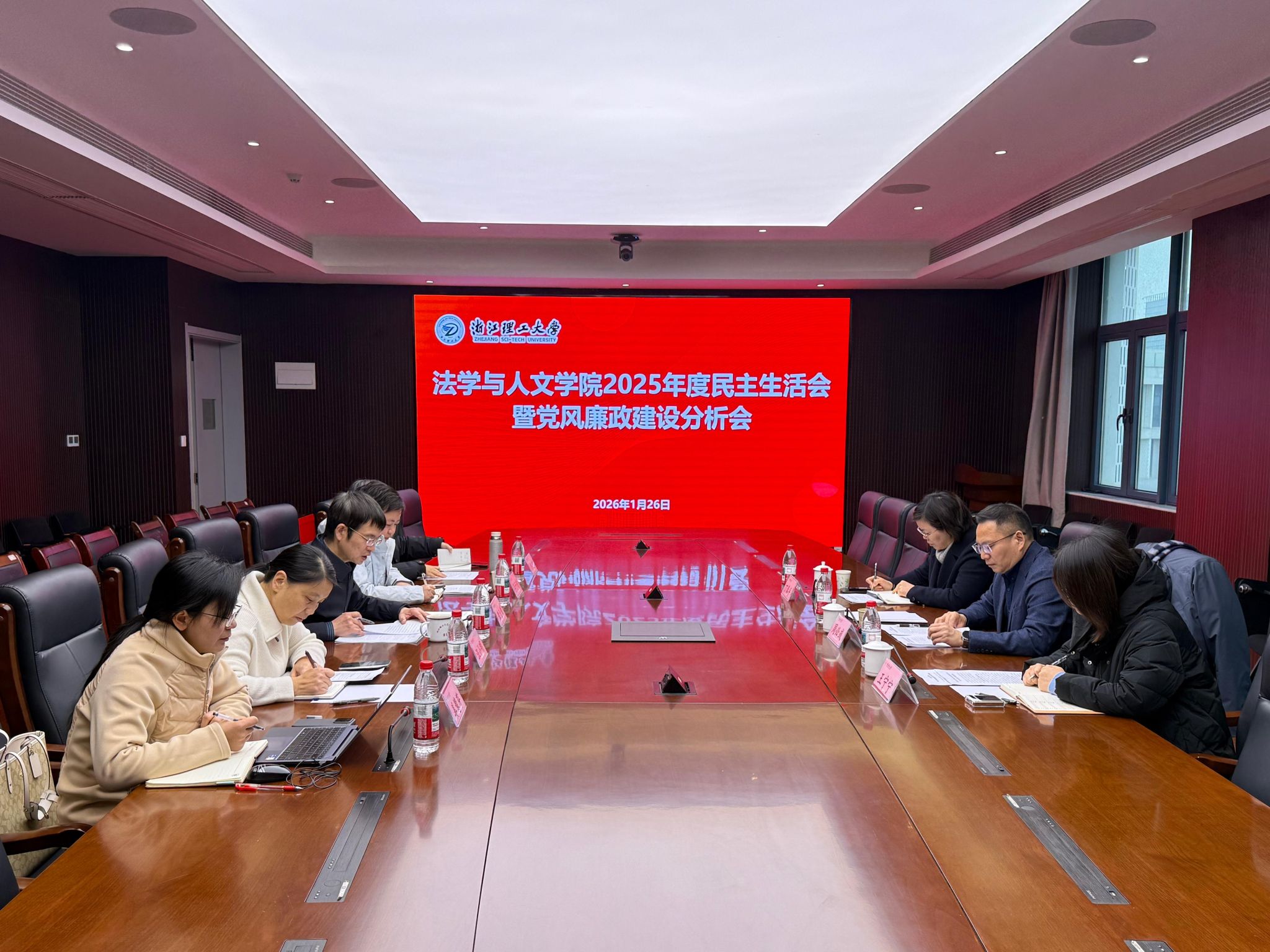 2026年1月26日上午,法学与人文学院党委在临平校区6A-527会议室召开2025年度党风廉政建设分析会和民主生活会。校党委委员、副校长周必彧出席会议。校党委组织部(党委统战部)副部长王宁宁、校纪委委员、理学院党委书记丁春平,法学与人文学院领导班子全体成员参加会议。会议由学院党委书记谭立章主持。