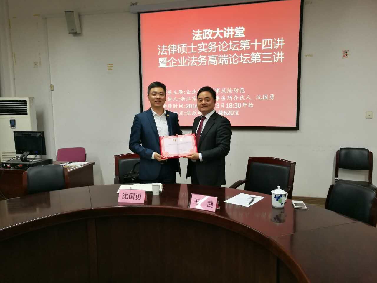 11月3日,浙江京衡律师事务所合伙人沈国勇律师来院作了题为企业家的刑事风险防范的专题讲座。讲座开始前,举行了法政学院实务导师聘任仪式,聘任沈律师为我院实务导师。讲座由院长王健教授主持,法律系教师郑旭江博士、党玺博士、朱光琪博士以及部分研究生和本科生也参加了本次讲座。
