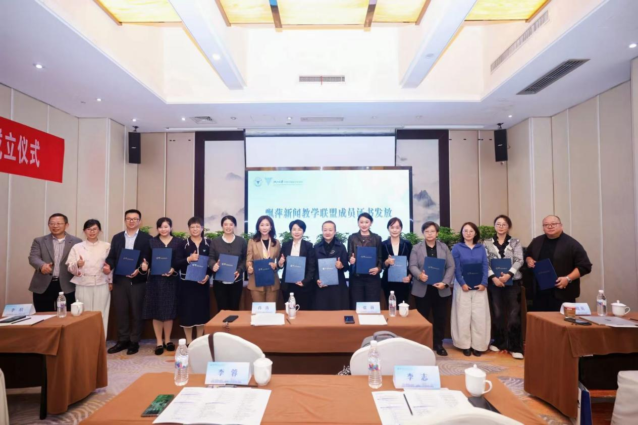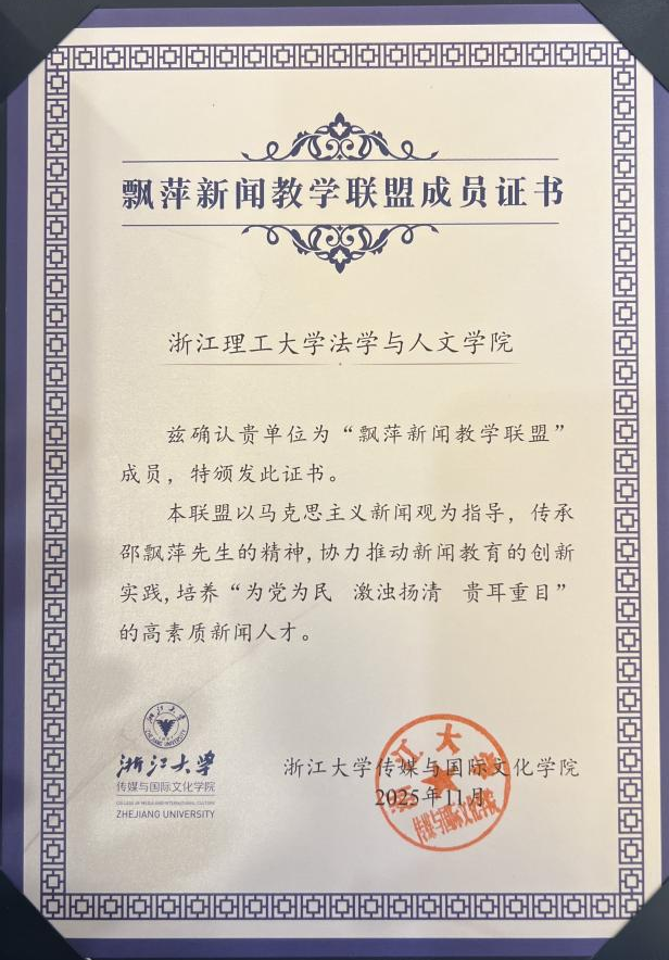 11月9日下午,浙江大学传媒与国际文化学院发起的“马克思主义新闻观拔尖创新人才培养研讨会暨飘萍新闻教学联盟成立仪式”在紫金港国际饭店举行。会上举行了“飘萍新闻教学联盟”揭牌仪式。副院长何苗教授、传播系董书华副教授应邀参与本次研讨会/仪式,浙江大学求是特聘教授吴飞为各学校代表颁发了成员证书,何苗代表学院加入该教学联盟,并接受证书。