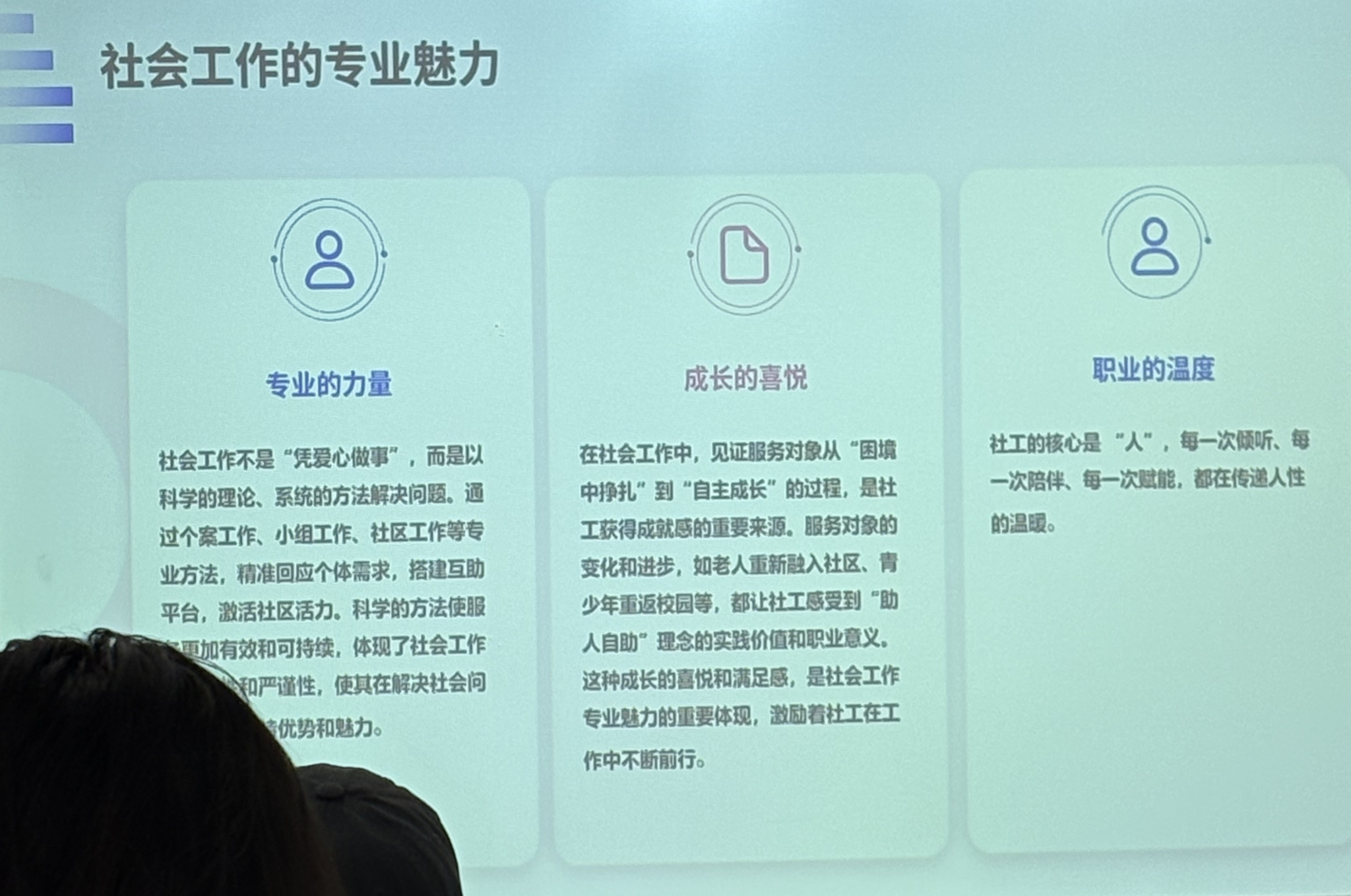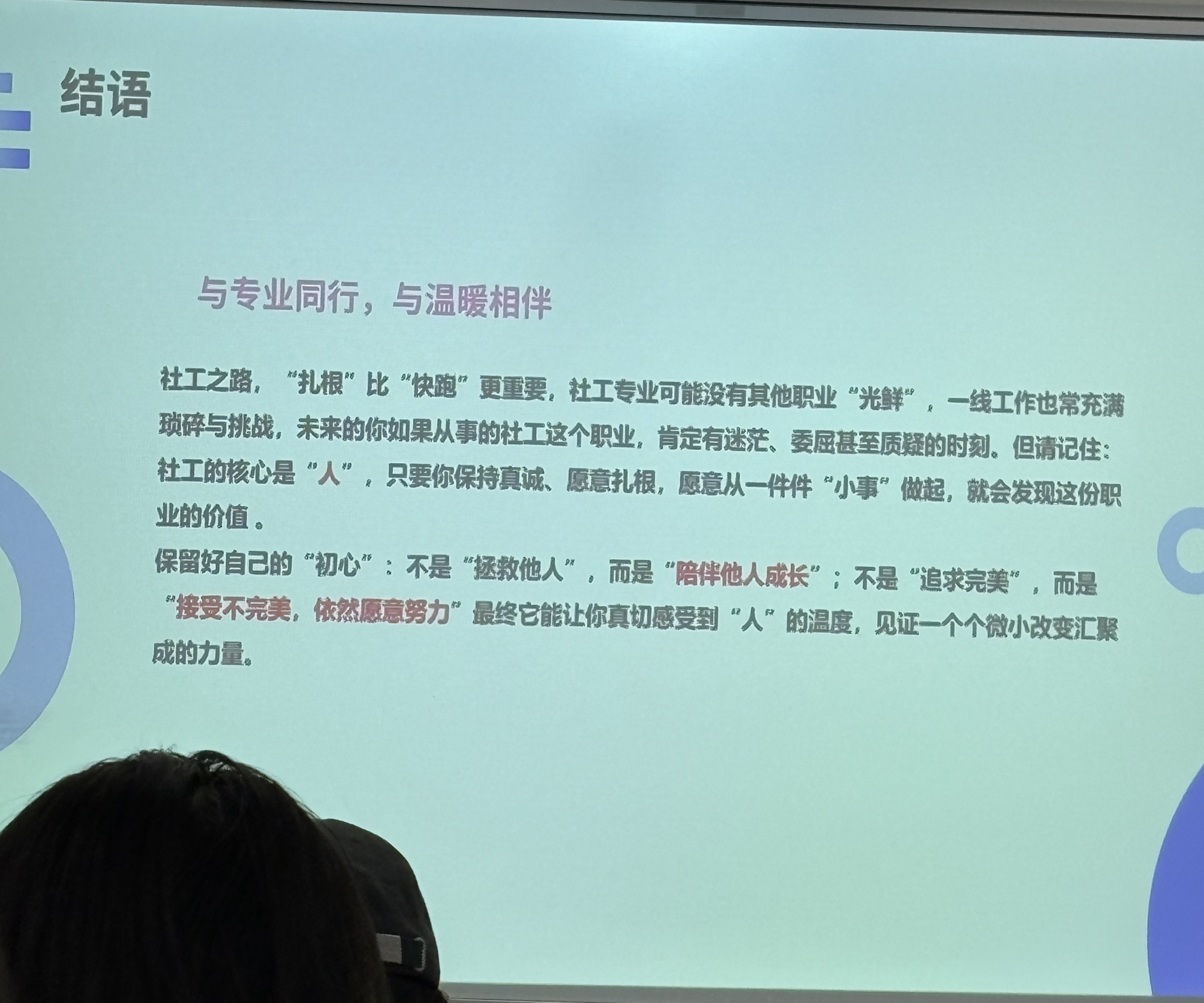至于社会工作专业的核心技能与素养,王丽萍老师总结了三大关键点:一是倾听,作为社工的“核心技能”,比“解决问题”更重要;二是资源整合,社工不是“单打独斗”,而是“连接者”;三是自我关怀,社工的“温暖”,需要先有“能量储备”。