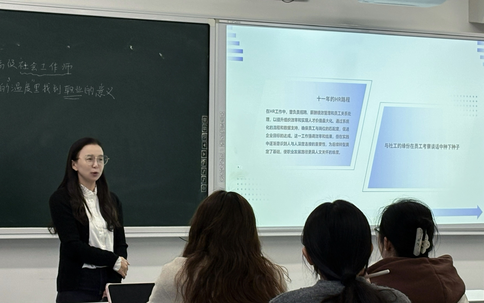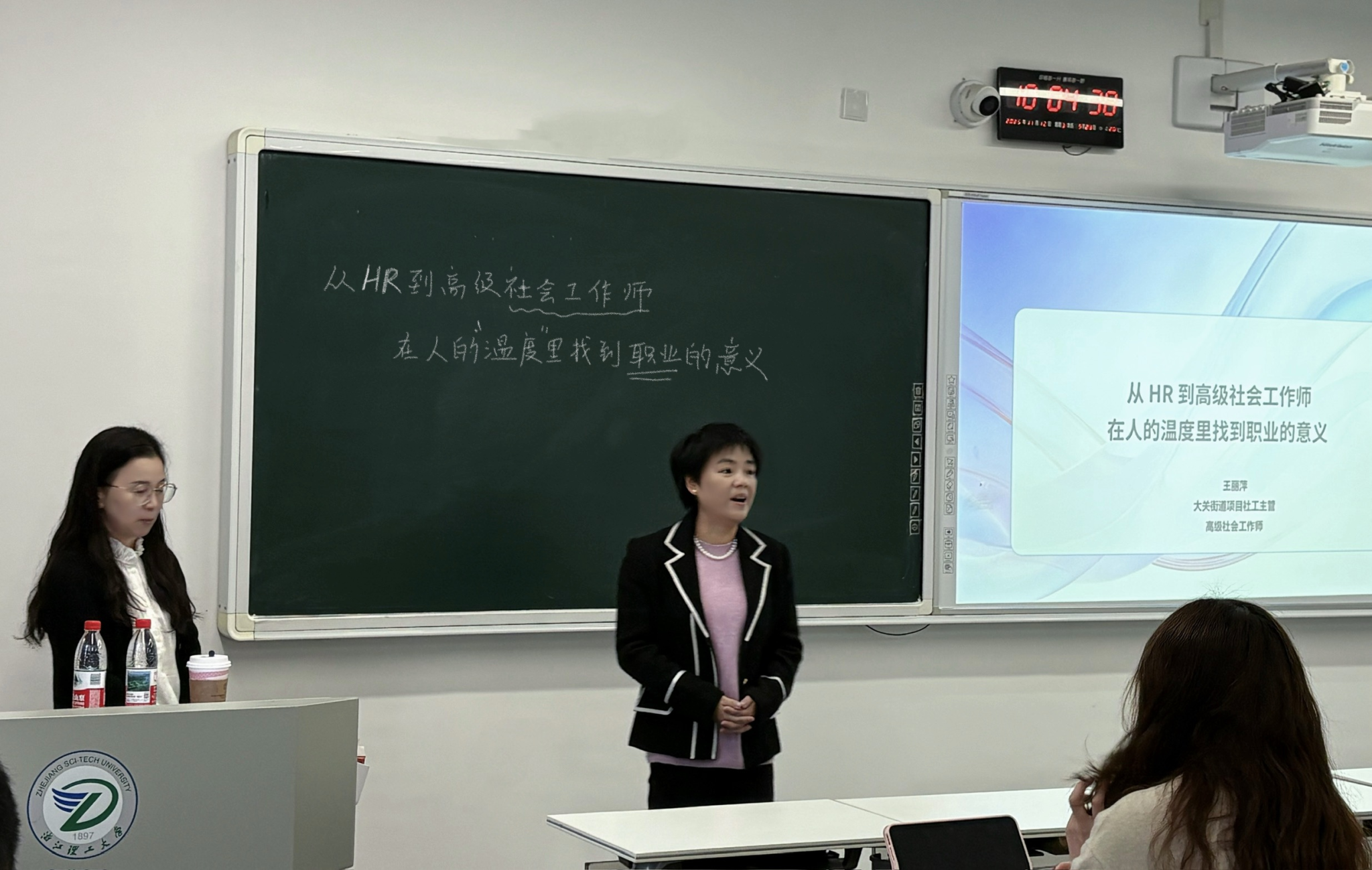 为了提高我院社会工作专业硕士的实务能力, 2025年11月12日,拱墅区高级社会工作师王丽萍来访我院,在L4-220教室为社会工作专业的硕士生进行了一场社会工作行业发展与职业规划的专题讲座,题目为《从HR到高级社工师:在人的温度里找到职业的意义》。讲座由社会工作系主任朱静主持。