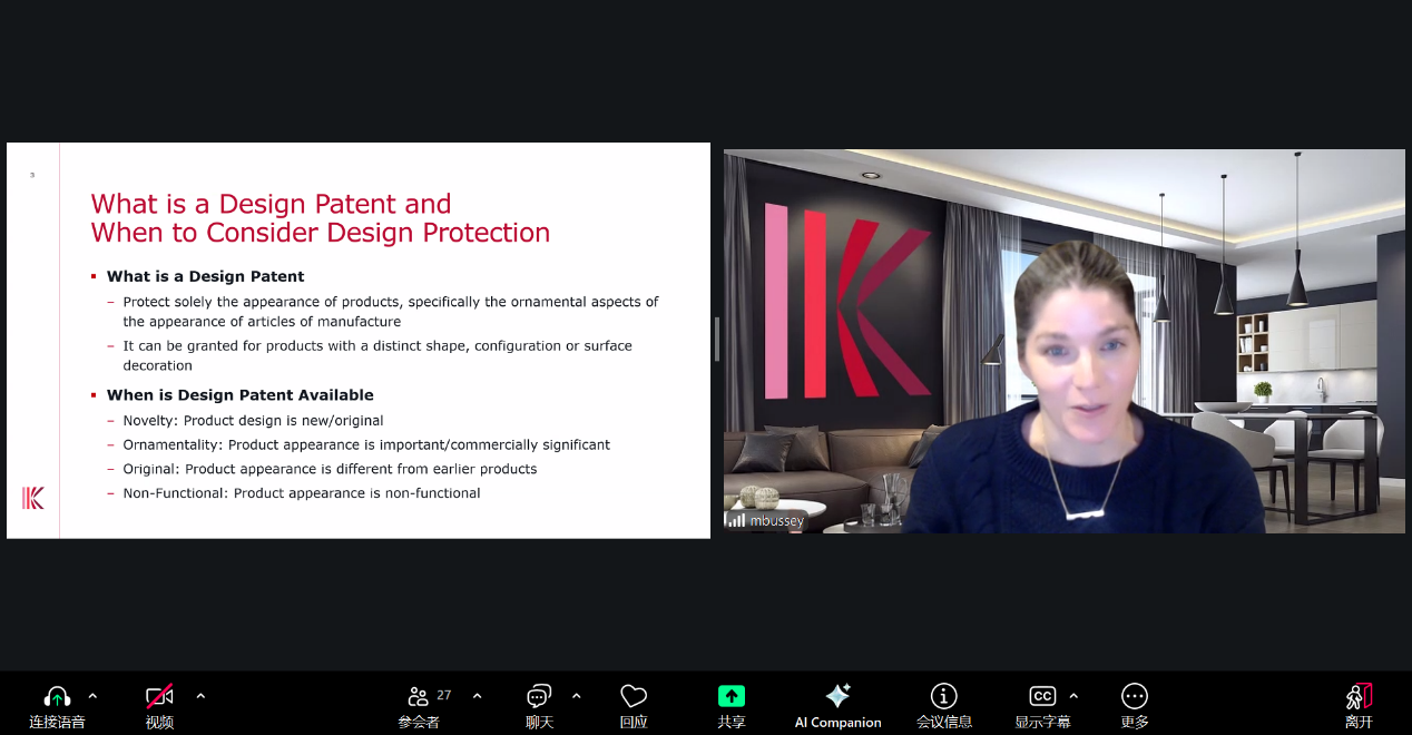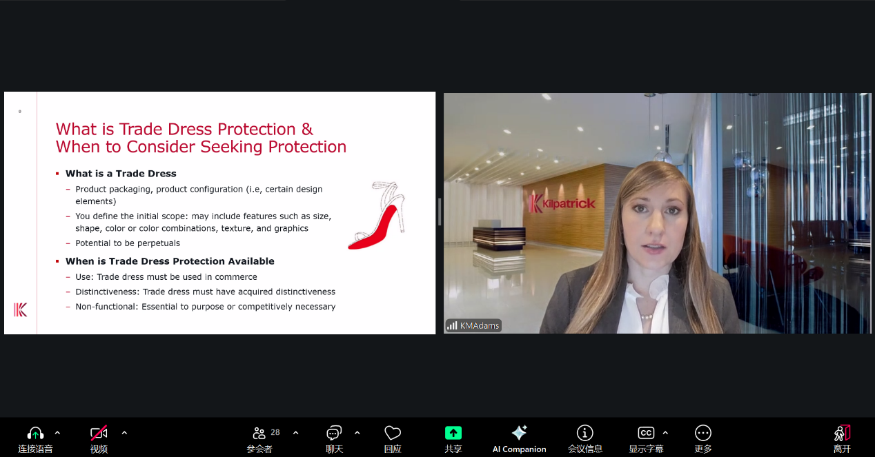 美国凯拓国际律师事务所合伙人Megan Bussey与美国凯拓国际律师事务所高级律师Kristin Adams共同带来题为“外观设计与专利权:协同保护之道——从美国法视角强化知识产权防护”的报告。两位嘉宾以美国实践为基础,强调设计专利因其“侵权即追缴全部利润”的特殊赔偿机制而成为时尚品牌最具威慑力的法律工具之一。她们指出,设计专利在时尚行业中尤为重要的原因在于其适应快节奏产品迭代的特性,既能在新品上市初期有效遏制仿制行为,也能作为品牌布局商业外观(trade dress)前的关键抓手。品牌可先利用设计专利进行“清场”,打击市场中的早期模仿,再辅以商标与商业外观形成可长期维持的识别体系。设计专利与商业外观在时间维度上彼此补充:前者提供短期强力排他性,后者则承担长期品牌资产的积累及续展。两位嘉宾最后强调,在美国实务中,时尚企业往往采用“设计专利 + 商标/商业外观 + 版权/合同”的组合模式,构建从产品外观到整体品牌表达的多层次保护体系。该模式不仅提升维权效率,也强化品牌的市场竞争力。