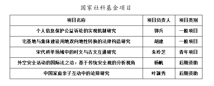 2025年各类国家级科研项目评审结果陆续揭晓。法学与人文学院喜获5项国家级项目立项(公示),其中包括国家社会科学基金一般项目2项、青年项目1项、后期资助2项项目,涉及法学、中国文学、语言学等多个学科。学院高度重视科研工作,稳步推进 2025年度国家基金项目的组织申报工作,实施了从选题培育、申报辅导、材料打磨、专家论证等一系列举措。学院将以此为契机,进一步推进有组织科研,开展好2026年度国家基金项目申报工作,鼓励更多教师融合热点主题,以更高质量科研成果服务国家战略需求。