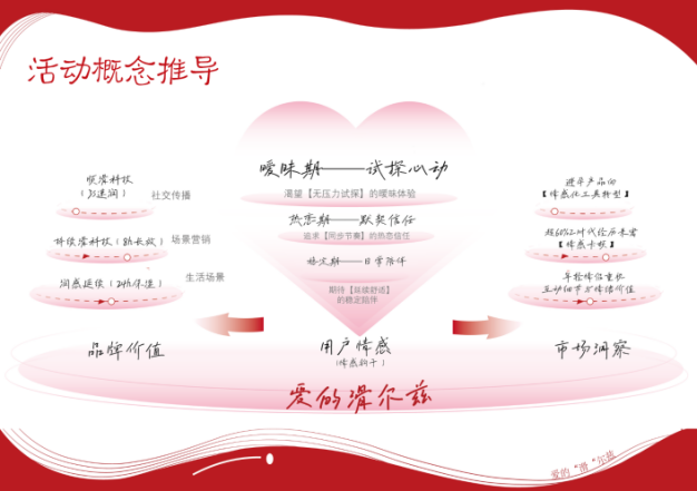 作品以「爱的“滑”尔兹」为主题,灵感源于品牌“瞬滑”科技与恋爱节奏的巧妙呼应。我们将亲密关系中的情感脉络——从初遇的悸动、热恋的默契到长久的温存——转化为三段式沉浸体验,通过“科技+情感”的双重表达,重塑避孕产品的品牌价值。