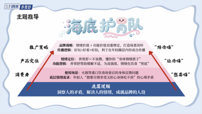 本策划案为三九胃泰养胃舒设计了一套完整的营销推广策略,特色在于与知名餐饮品牌海底捞联名,针对当下年轻人的底层情绪,确立“情绪价值+功能价值”的差异化年轻化战略。三九胃泰养胃舒作为一个“搭子”形象,为年轻人不规律的饮食“兜底”。营销活动分为集结、冲锋、接力三个阶段,能够让受众深度参与并产生情绪共振。
