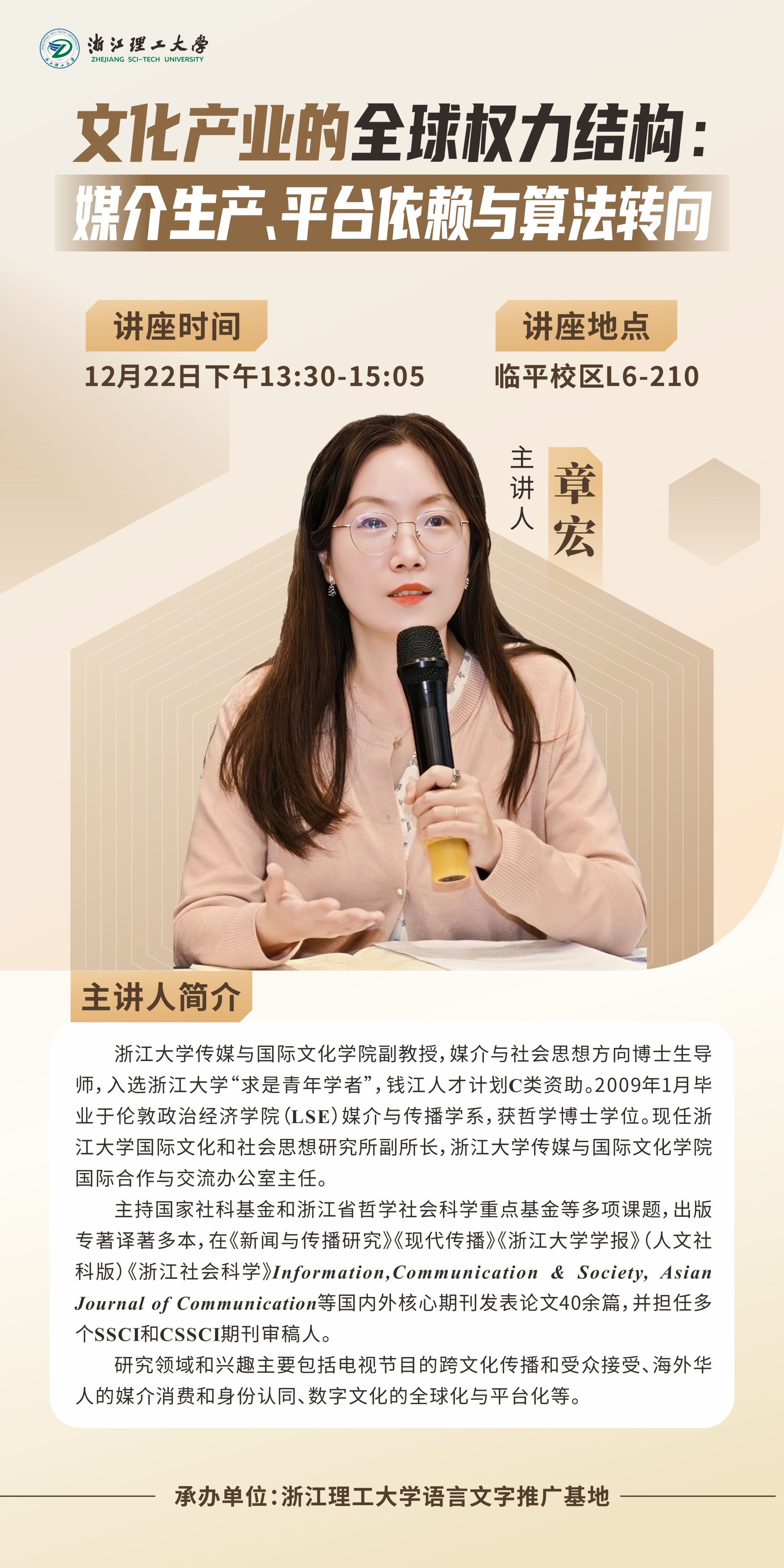12月22日下午,浙江理工大学在临平校区L6-210教室成功举办《文化产业的全球权力结构:媒介生产、平台依赖与算法转向》专题讲座。本次讲座由浙江理工大学语言文字推广基地承办,学院副院长何苗主持,浙江大学传媒与国际文化学院副教授、博士生导师章宏主讲,传播系研究生到场聆听学习。