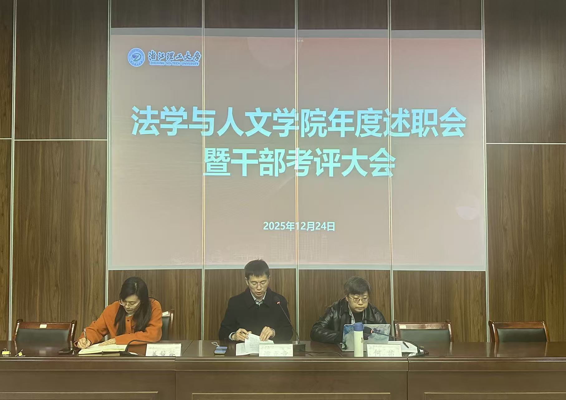 12月24日下午,法学与人文学院在临平校区6A楼107室召开2025年度中层干部述职会议暨干部考评大会。学院领导班子成员、全体教职工参加会议,会议由学院党委书记谭立章主持。